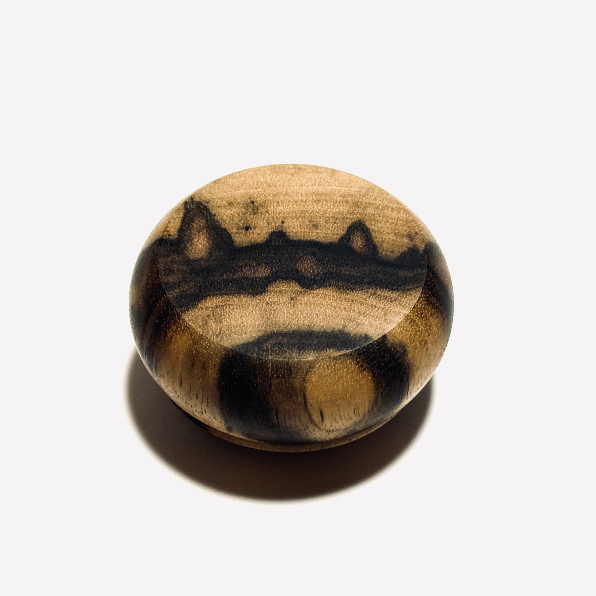 Though small enough to fit in the palm of your hand, this incense box has an exceptional presence. It's perfect for use in tea ceremonies, but also highly valuable as a work of art; opening the lid reveals the exquisite beauty of the wood grain. Its simple shape maximizes the beauty of the black persimmon wood's pattern and texture.