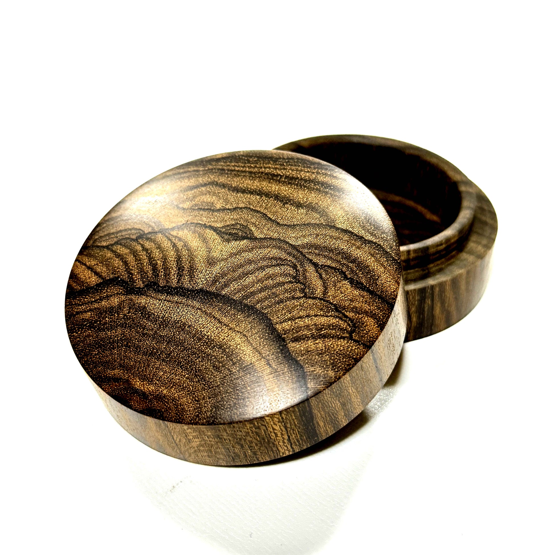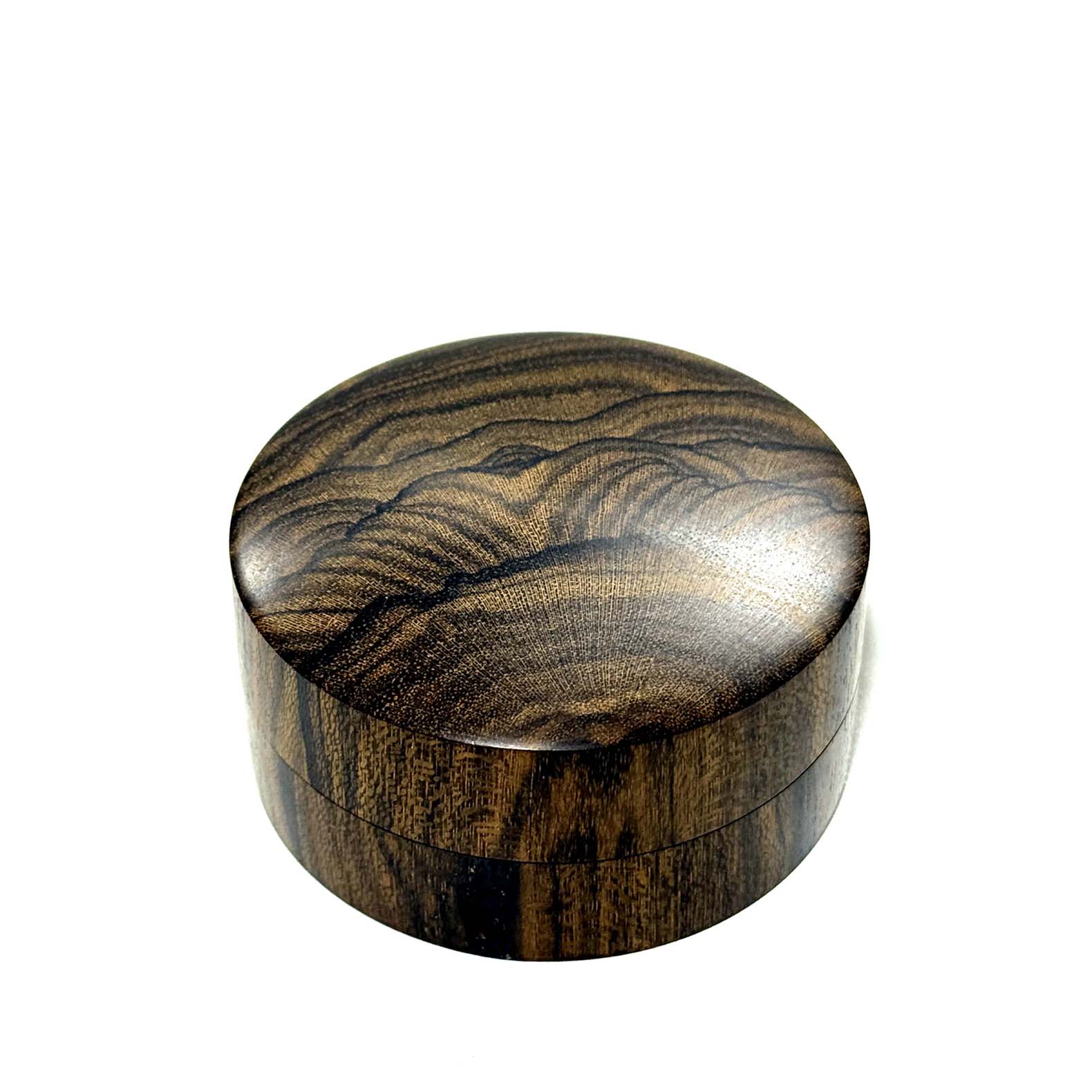 縦木取りならではの、立体感のある波紋のような木目が全面に広がり、自然が生み出した景色をそのまま閉じ込めたような表情を見せます。精緻な轆轤挽きによって、シャム柿の硬質で緻密な質感が滑らかに仕上げられ、手に取るとしっとりとした心地よい感触が伝わります。香を納める器としてはもちろん、卓上の工芸品としても存在感を放つ逸品です。縞模様の表れ方は一点ごとに異なり、同じものは二つとありません。