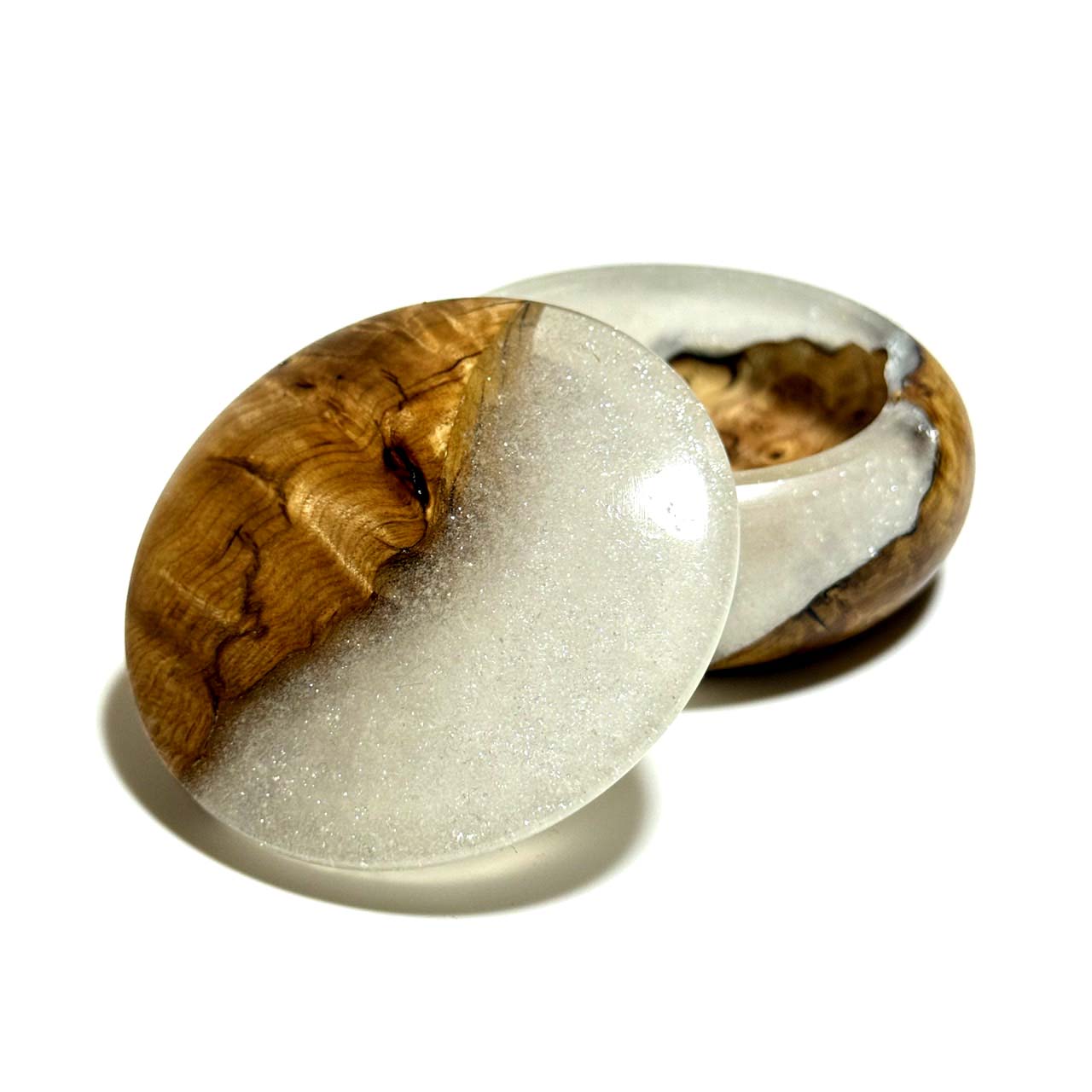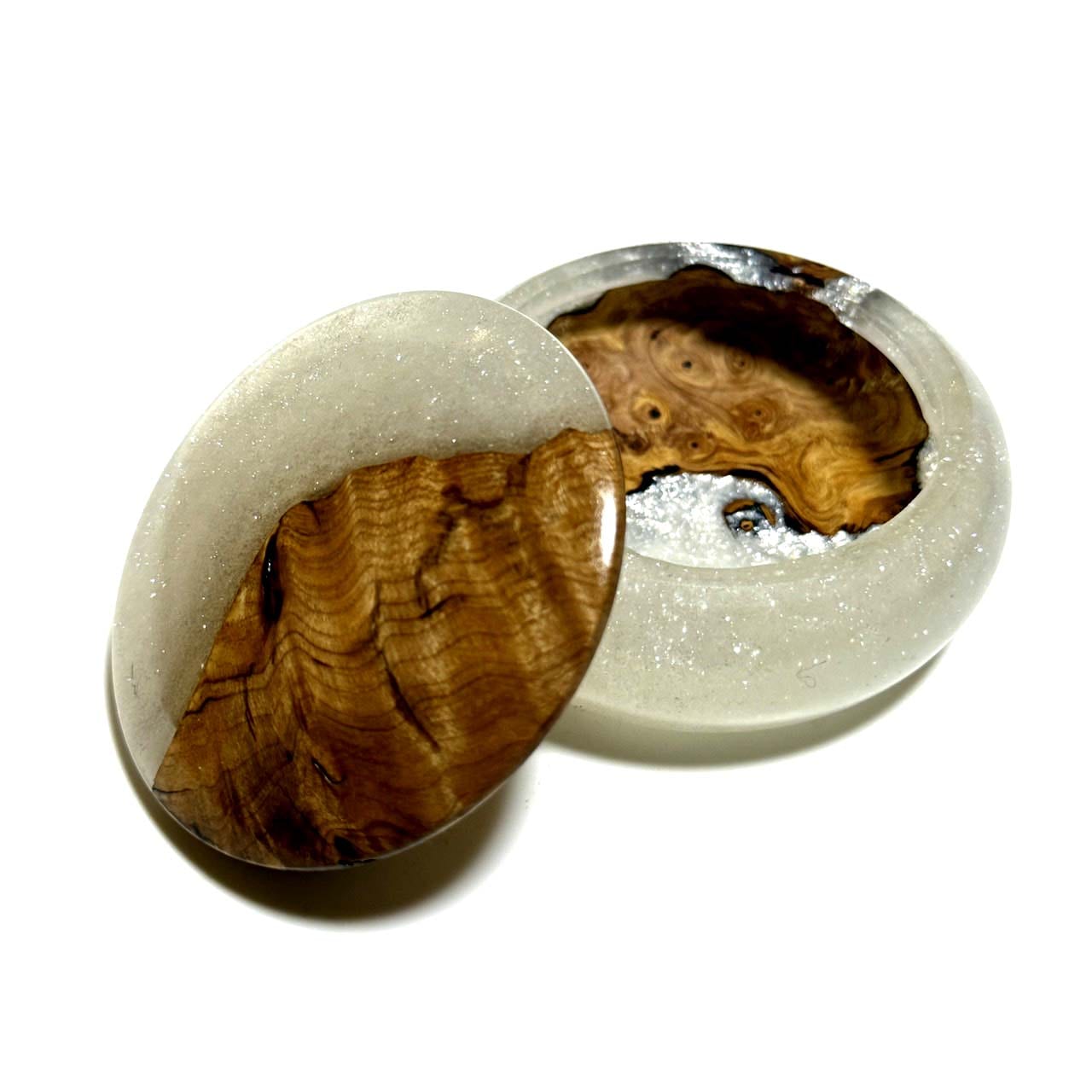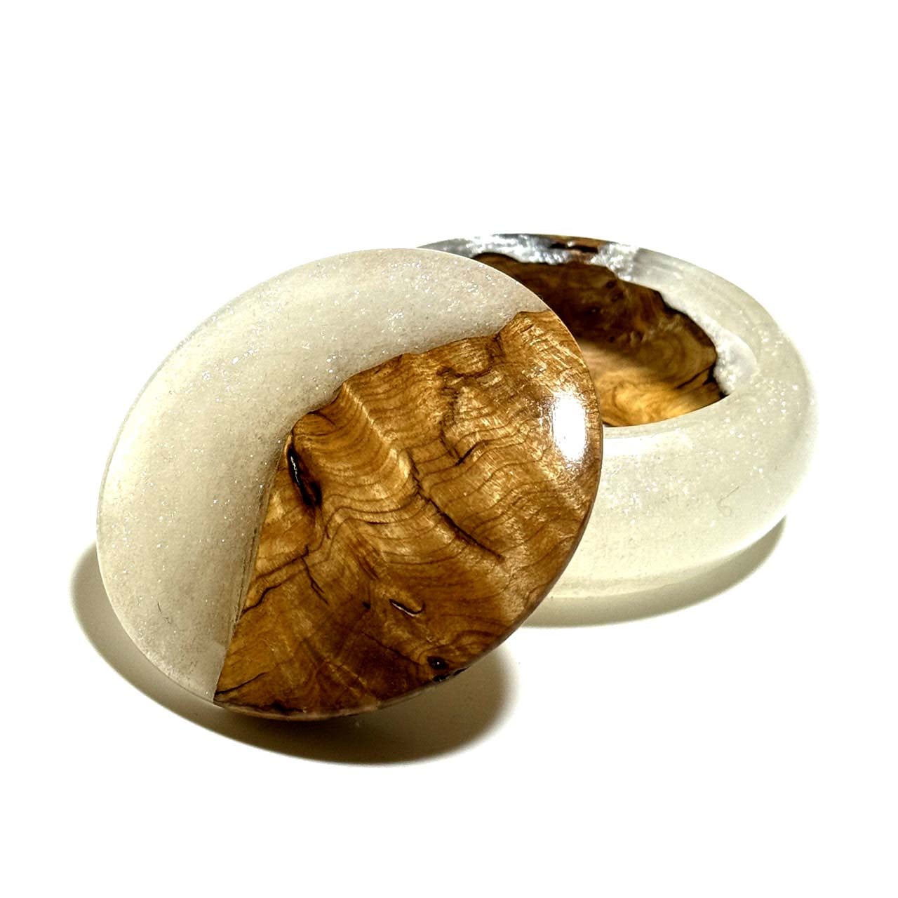 本作「雪華(せっか)」は、楓瘤(かえでこぶ)の豊かな杢目と、きらめくパールホワイトレジンが溶け合い生まれた一点物の香合です。