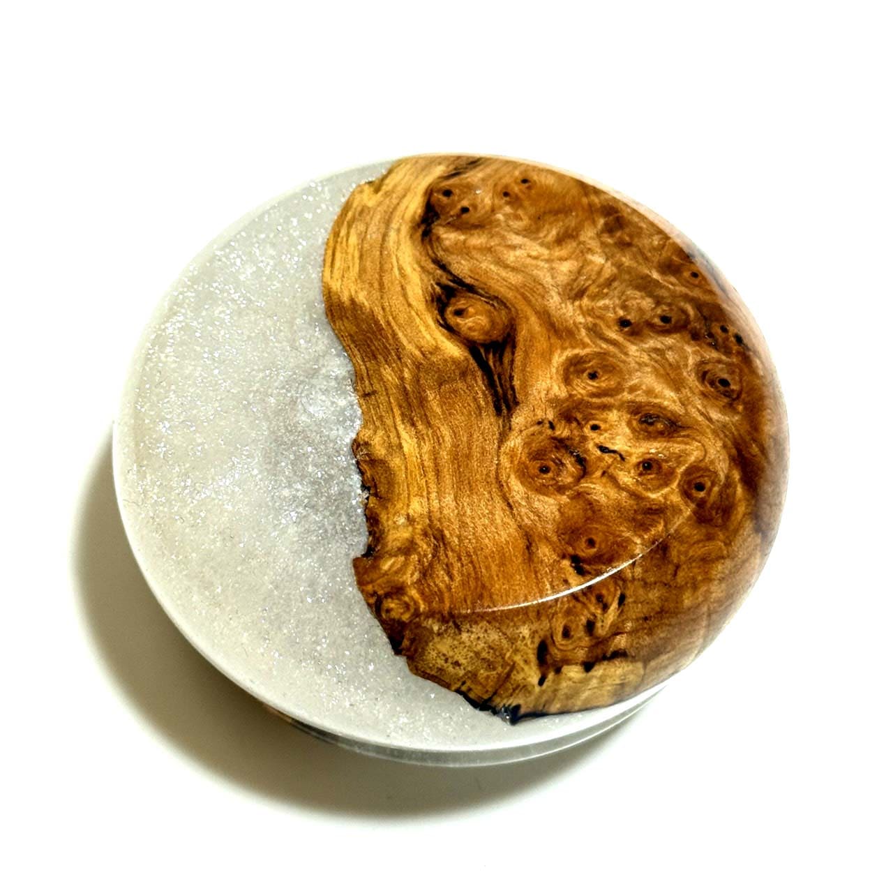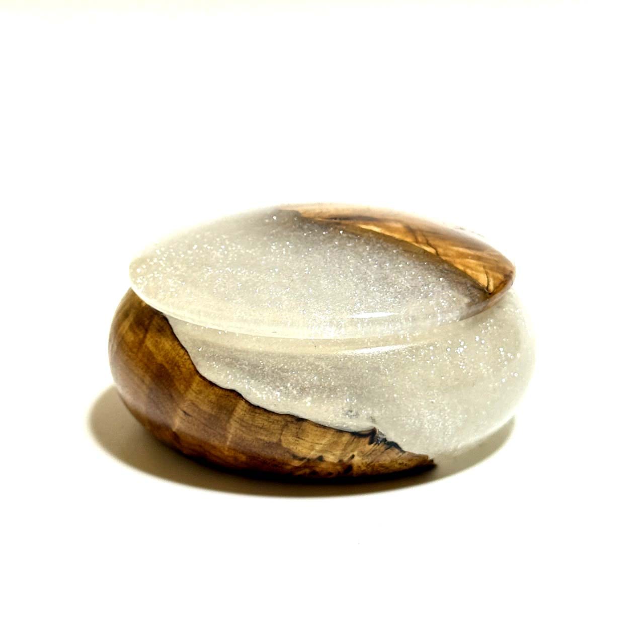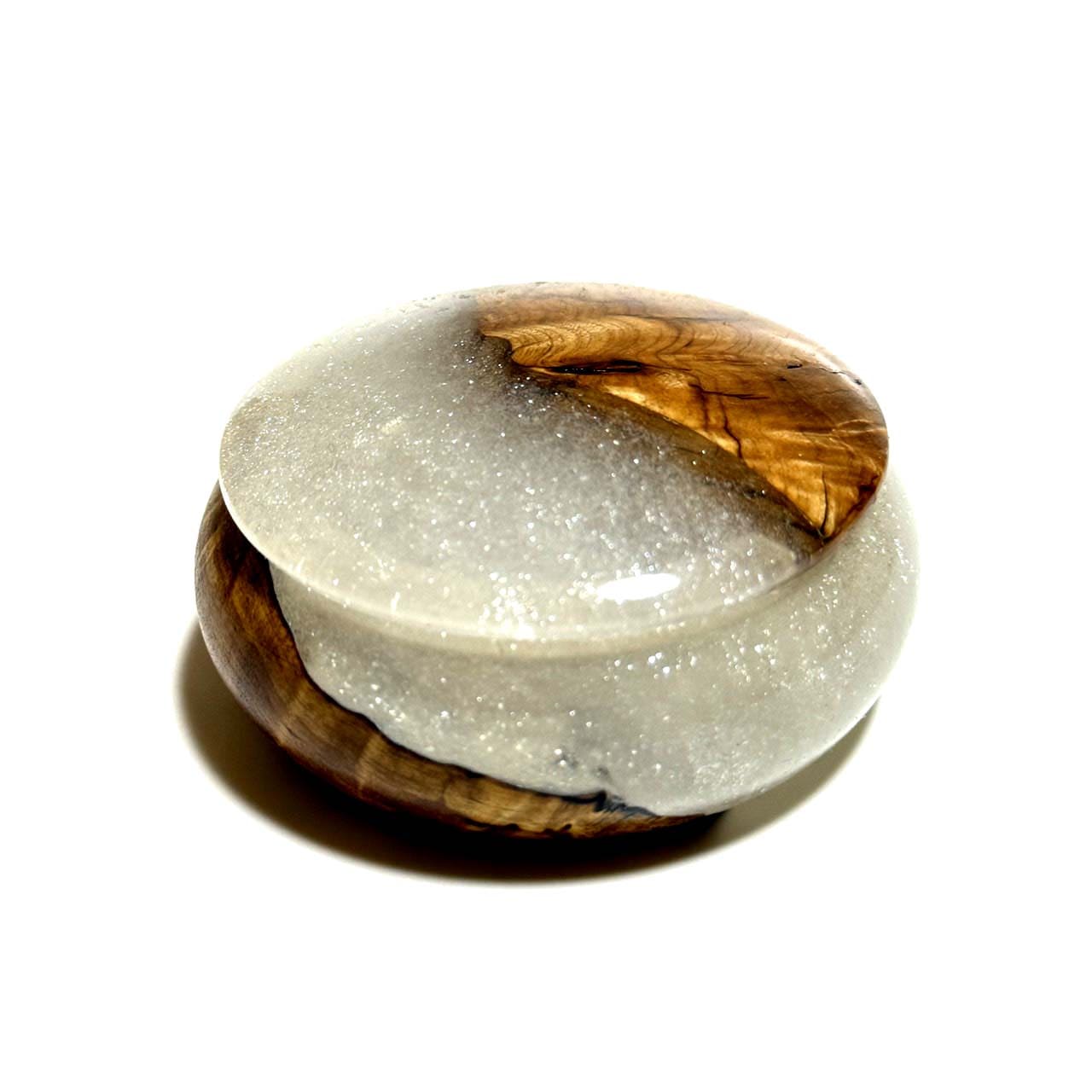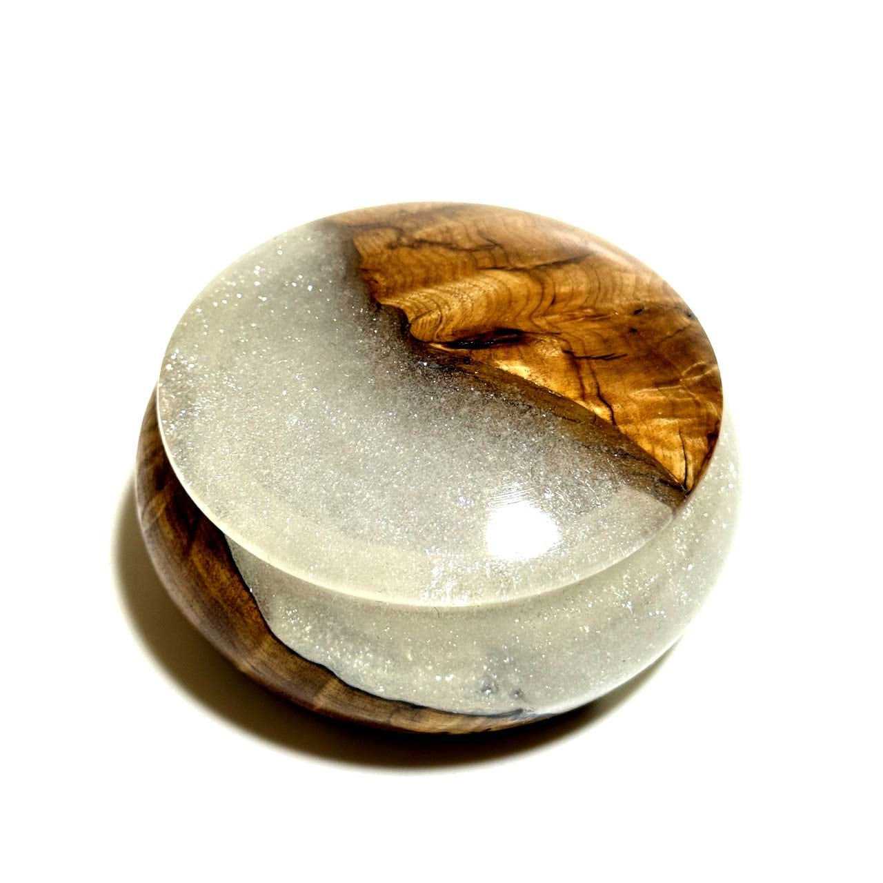 本作「雪華(せっか)」は、楓瘤(かえでこぶ)の豊かな杢目と、きらめくパールホワイトレジンが溶け合い生まれた一点物の香合です。