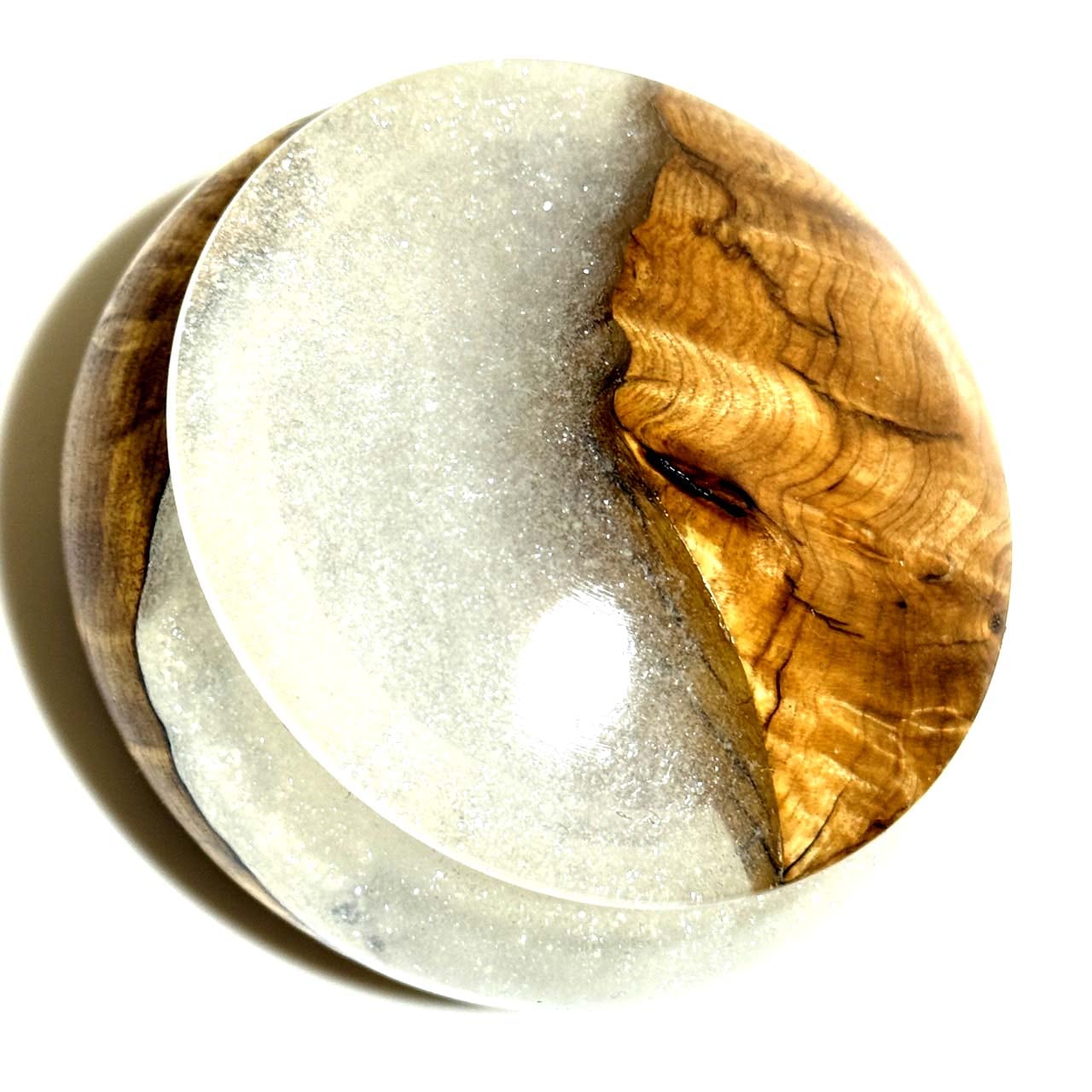 楓瘤は、樹木が長い年月をかけて形成する希少な部位で、その杢目はまるで大地の記憶を刻むかのような立体的な模様を描きます。その温かみある木肌に、純白の雪を思わせるレジンが寄り添い、淡く光を抱え込むようにきらめきます。見る角度や光の加減によって表情を変えるその輝きは、まるで雪明かりの夜のような幻想的な趣を感じさせます。