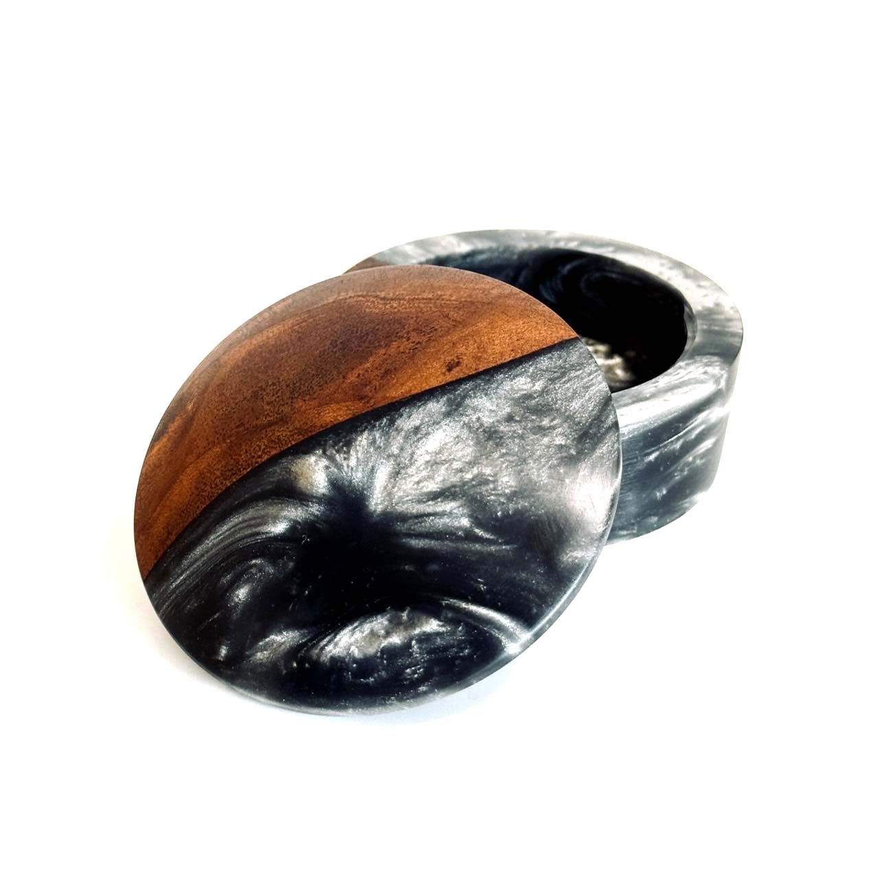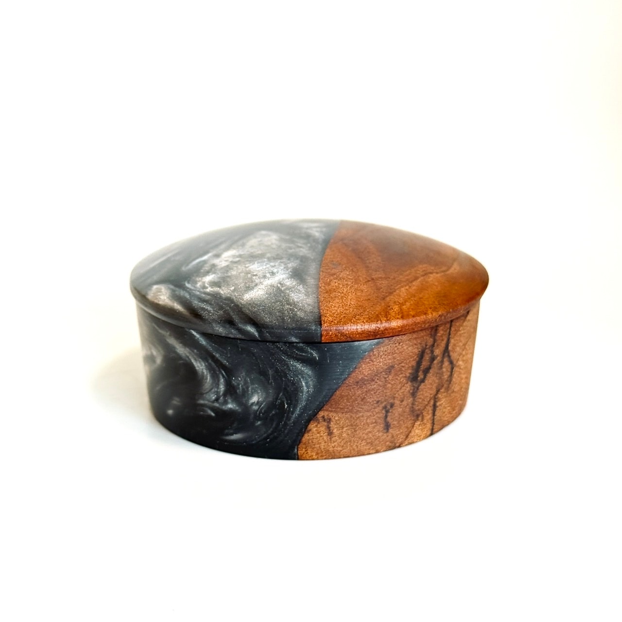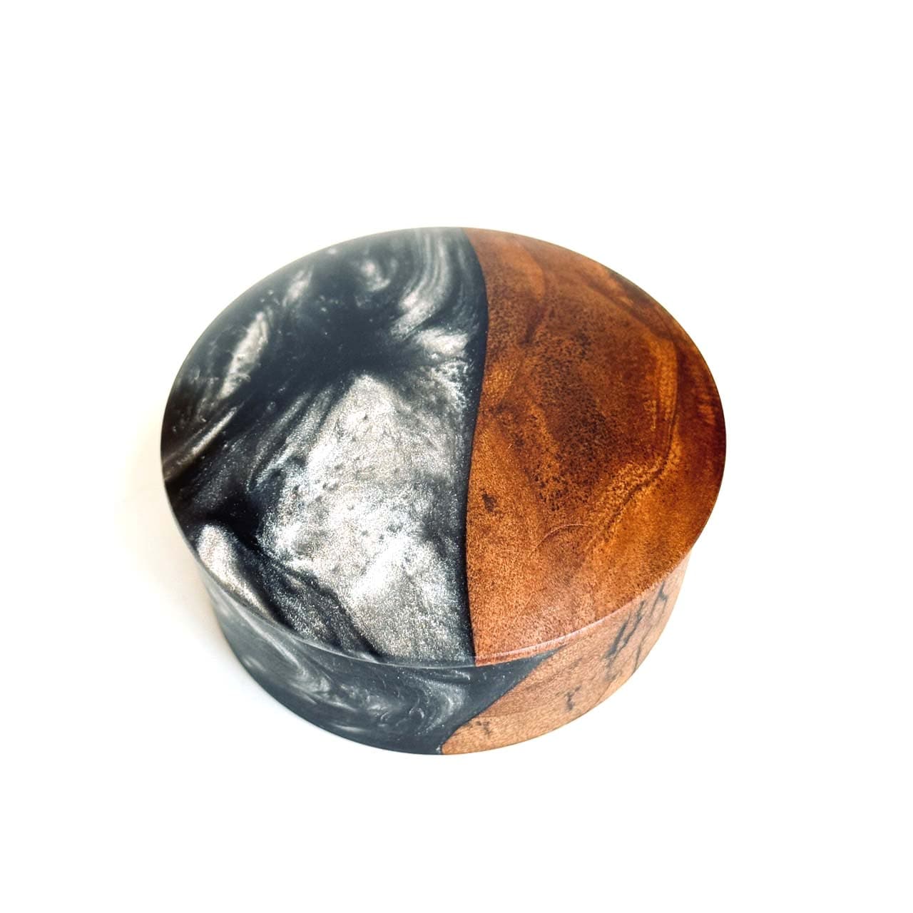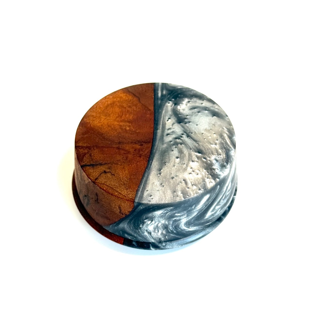 この香合は、自然が長い歳月をかけて育んだ楓瘤の本身部分と、流れるような銀色のレジンを融合させて生まれた一点物です。
