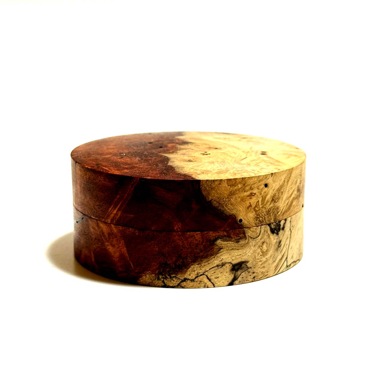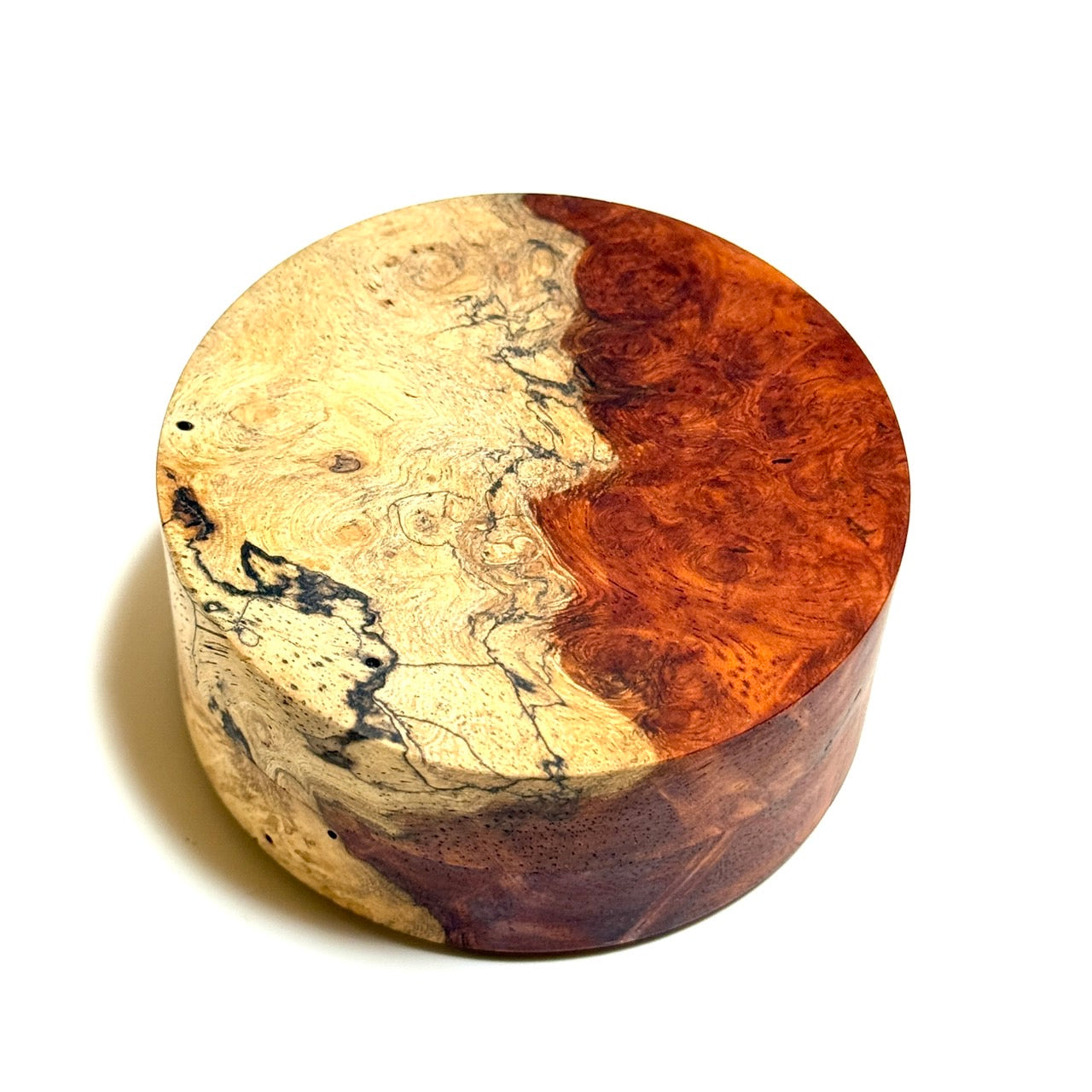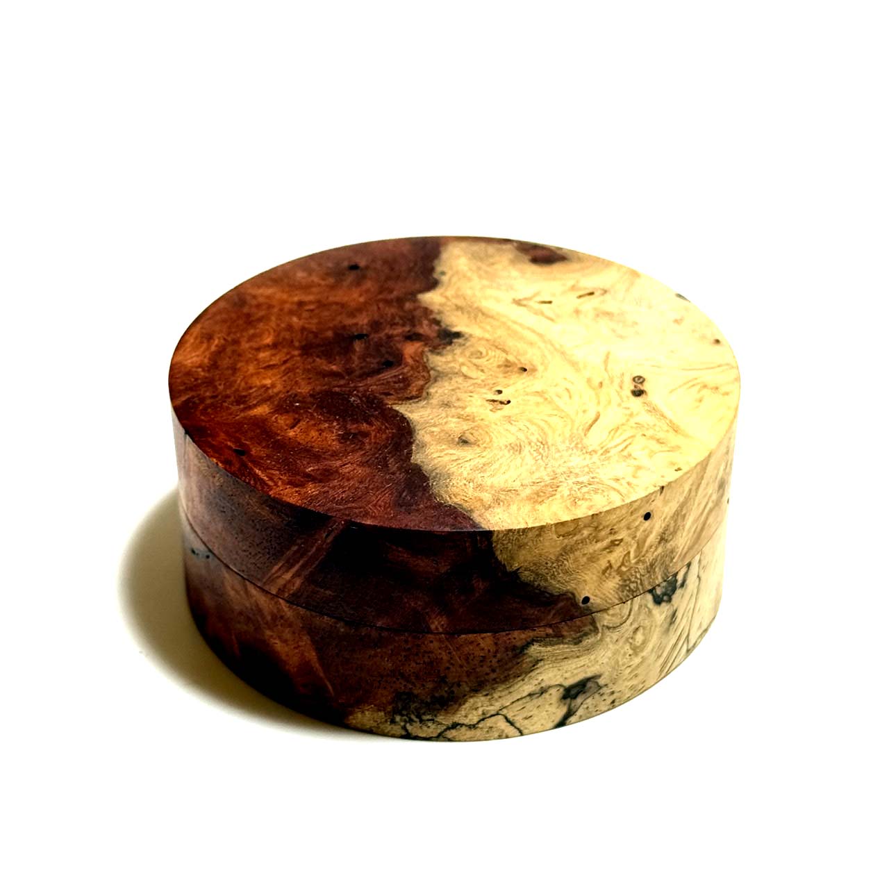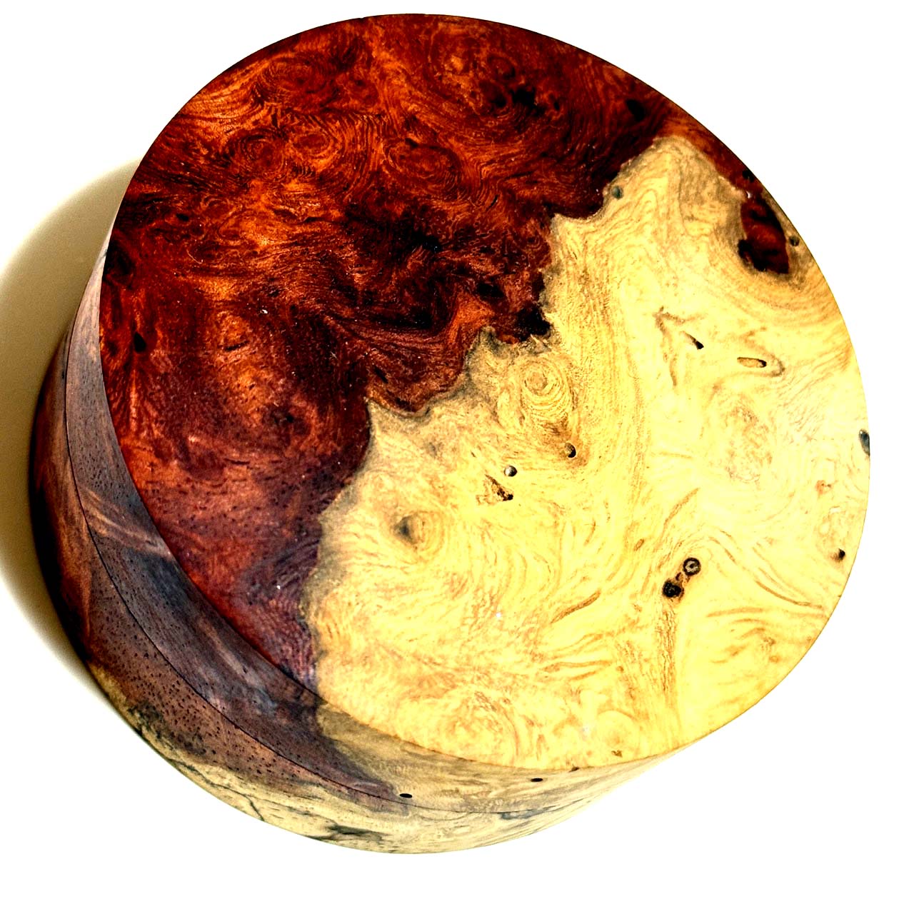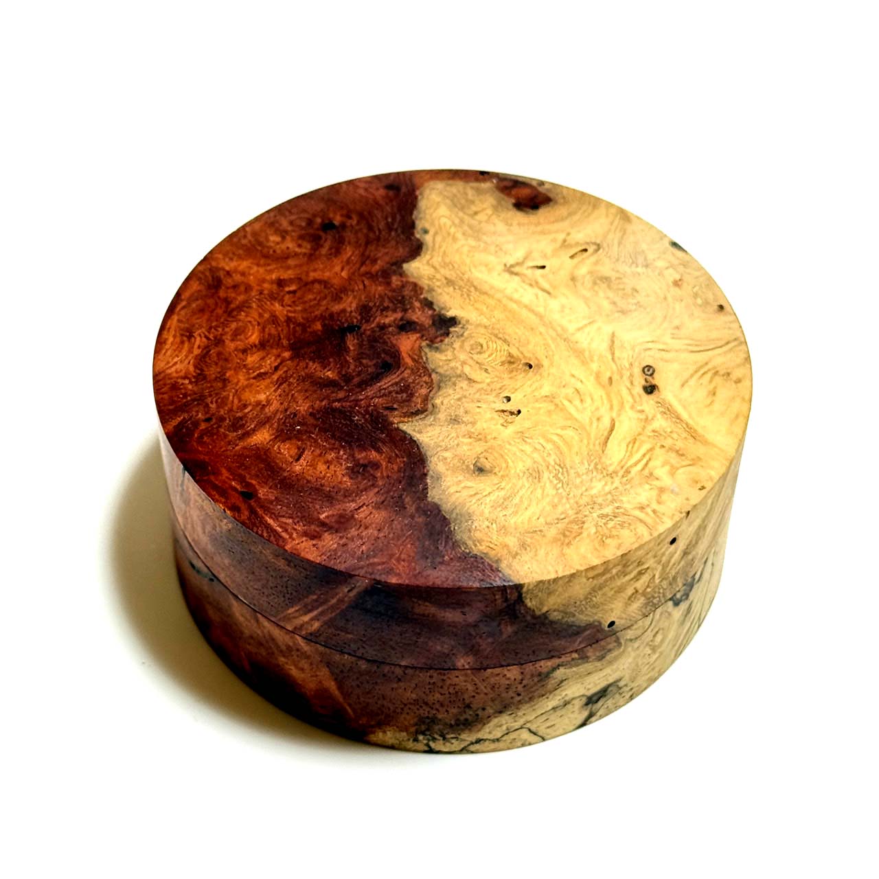 掌に収まる小さな器ながらも、紅白杢の鮮烈なコントラストと瘤杢の深淵な模様が、鑑賞物としても香を納める器としても圧倒的な存在感を放ちます。木工芸の妙味と自然の造形美が融合した、唯一無二の逸品です。
